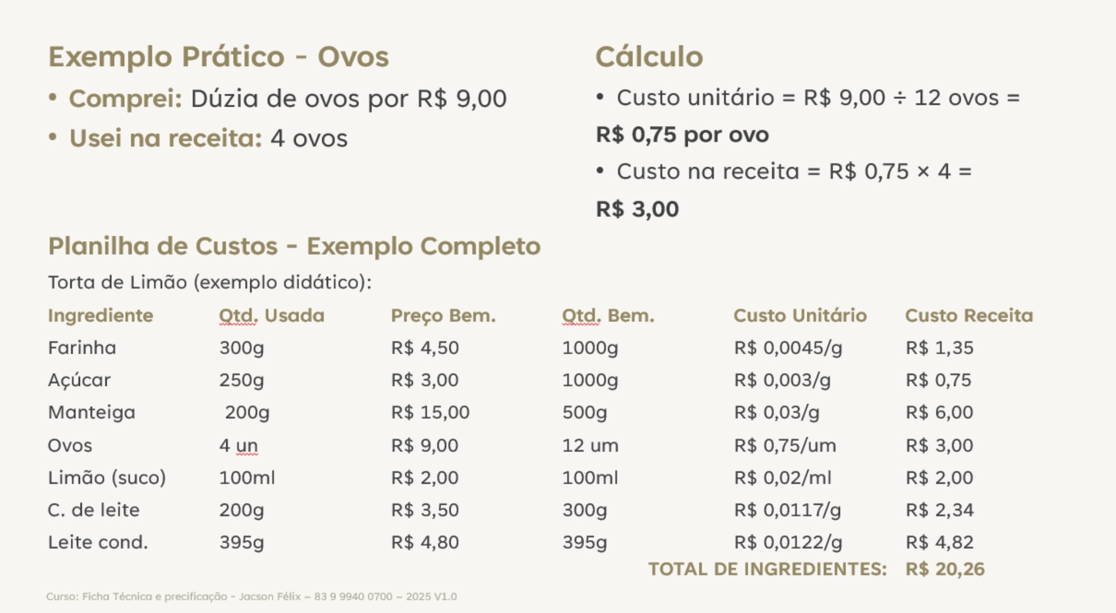 Você vai construir suas próprias fichas técnicas do zero: ingredientes, modos de preparo, custos e padronização.